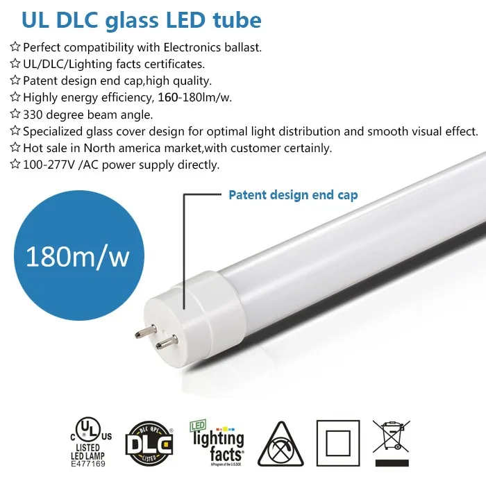 Advantages of 180lm/w 10w glass led tube UL DLC listed led tube
